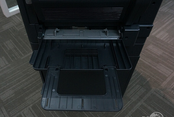 除了標配一個250頁的進紙盒之外,在機身的側面,上文提到了許多機關,其中一個便可以打開多功能手送托盤,柯尼卡美能達306的多功能手送托盤支持紙張最大的容量為100張,支持的紙張尺寸為A3到A5。