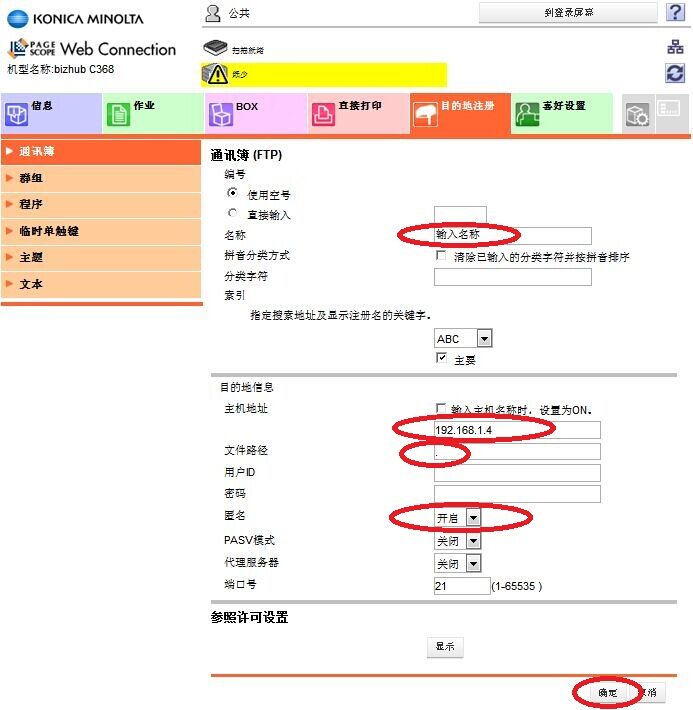 4)在“名稱”輸入計(jì)算機(jī)名稱,在“主機(jī)地址”中輸入計(jì)算 機(jī)的IP地址,在“文件路徑”中輸入“.”然后點(diǎn)擊確認(rèn)。
